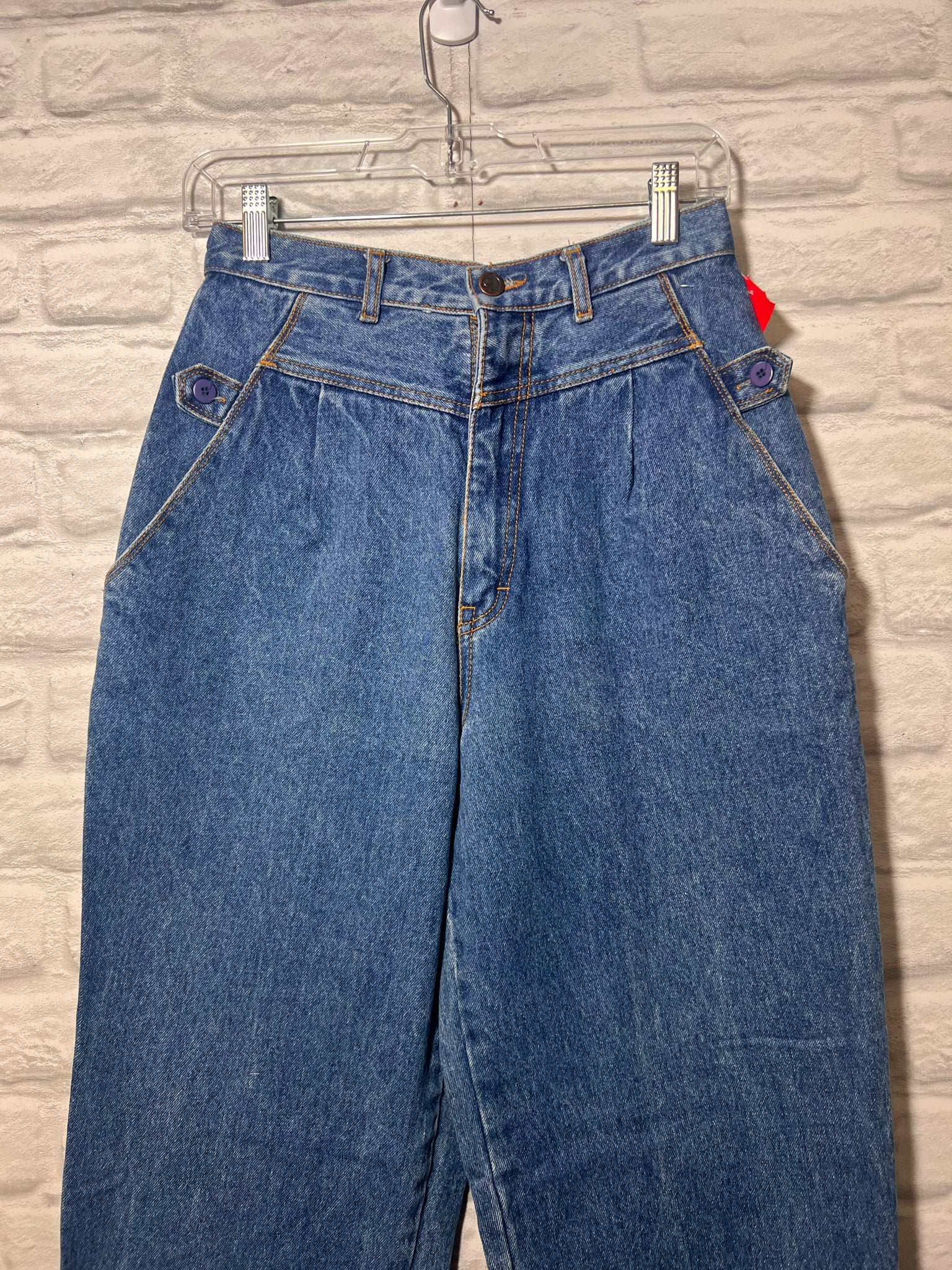 Sync by Union Bay vintage mom jeans featuring a high waist, button detail high pockets and tapered fit in med/dark wash denim. Hi waist measures 12.5" flat, rise 13", inseam 30". Heavy duty denim, 100%^ cotton.