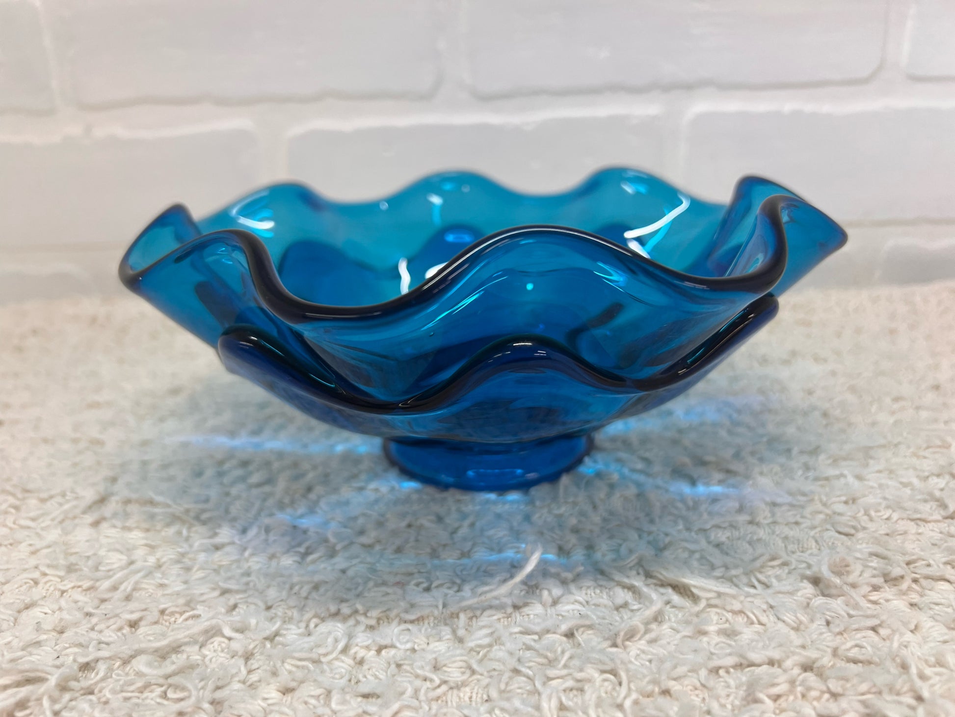 Viking Glass MCM Double Ruffle Blue Blown Glass Bowl