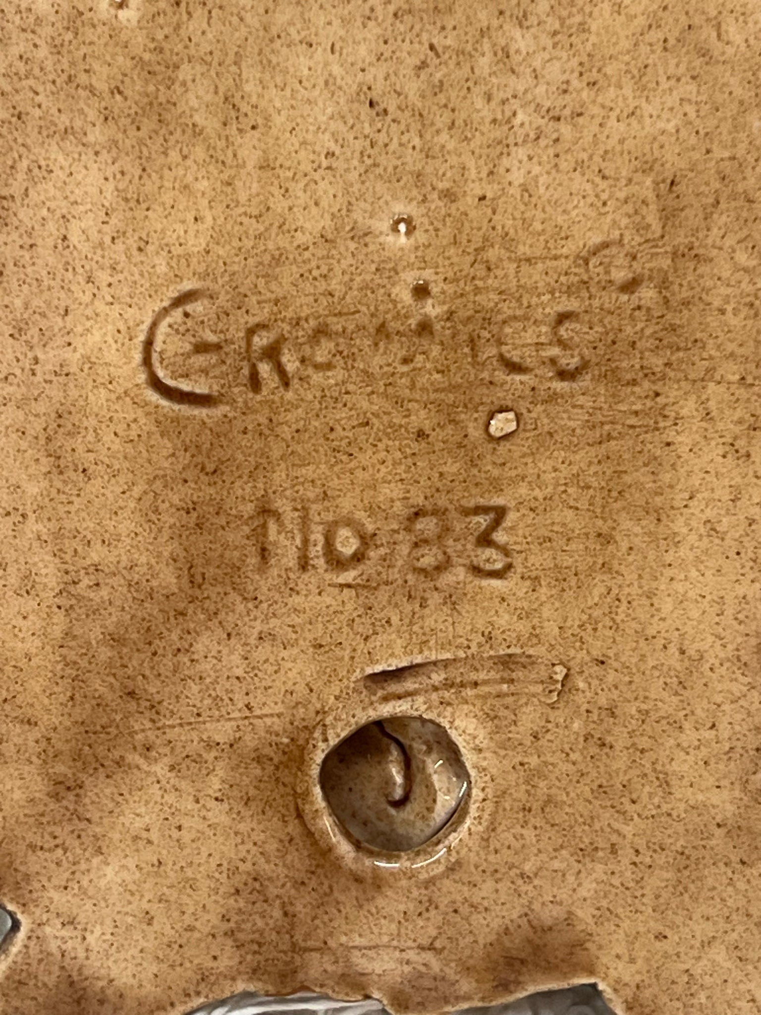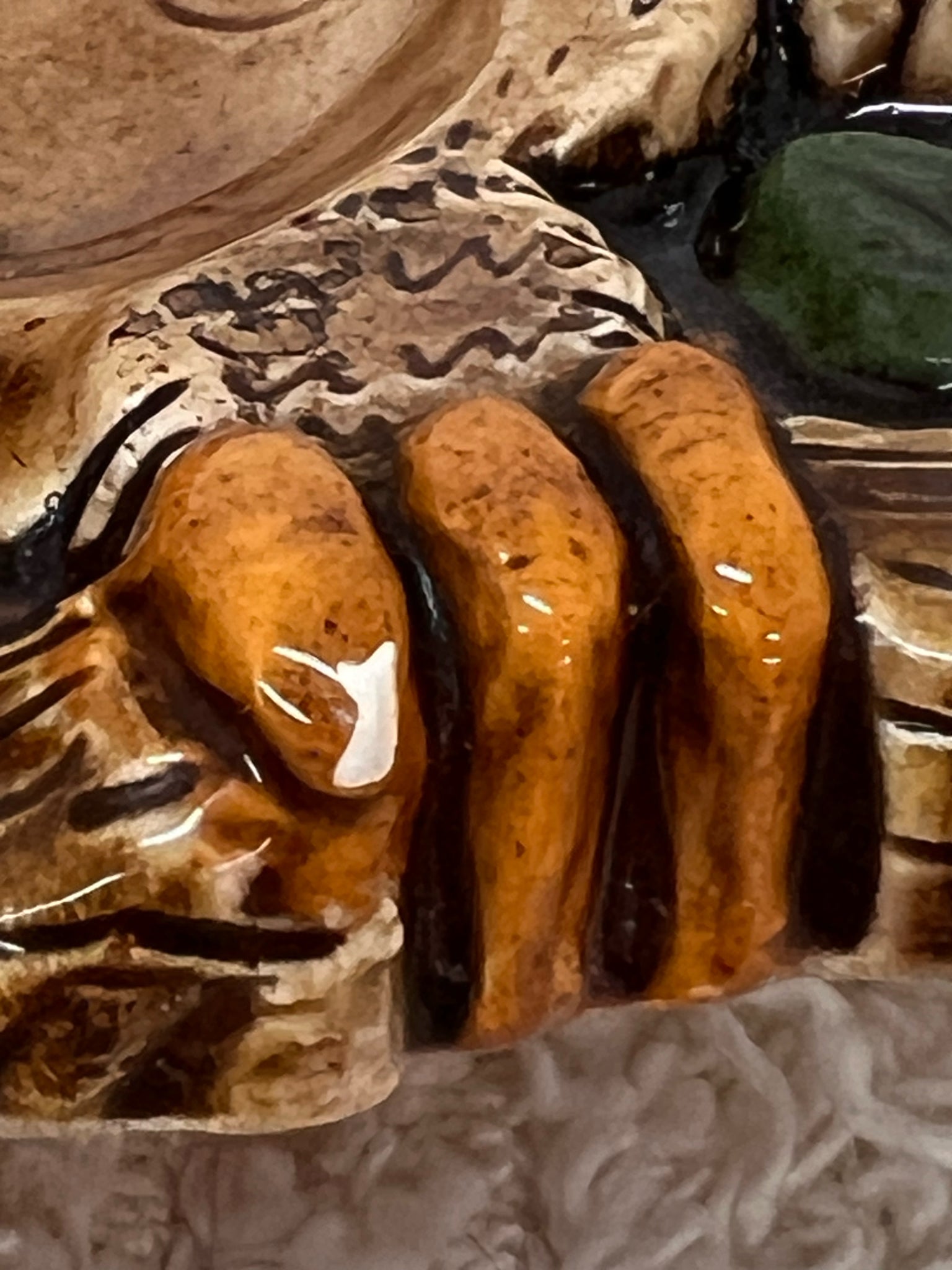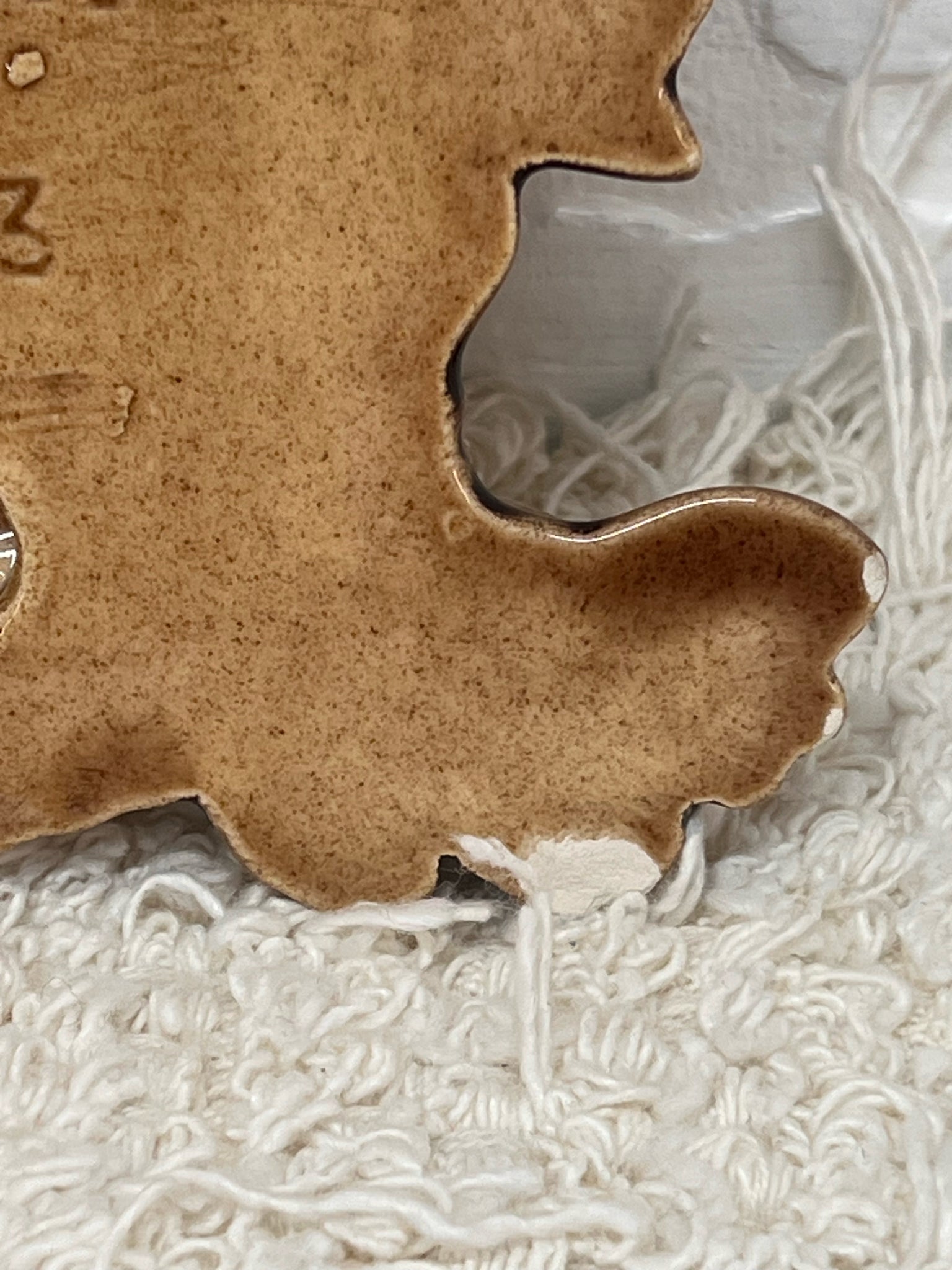 Vintage ceramic owl spoon rest or wall plaque, circa 1980's, adorable! Brown/green/rust orange, a couple small chips to bottom back and one to owl's left toe. Measures approx 6" tall by 4" wide.