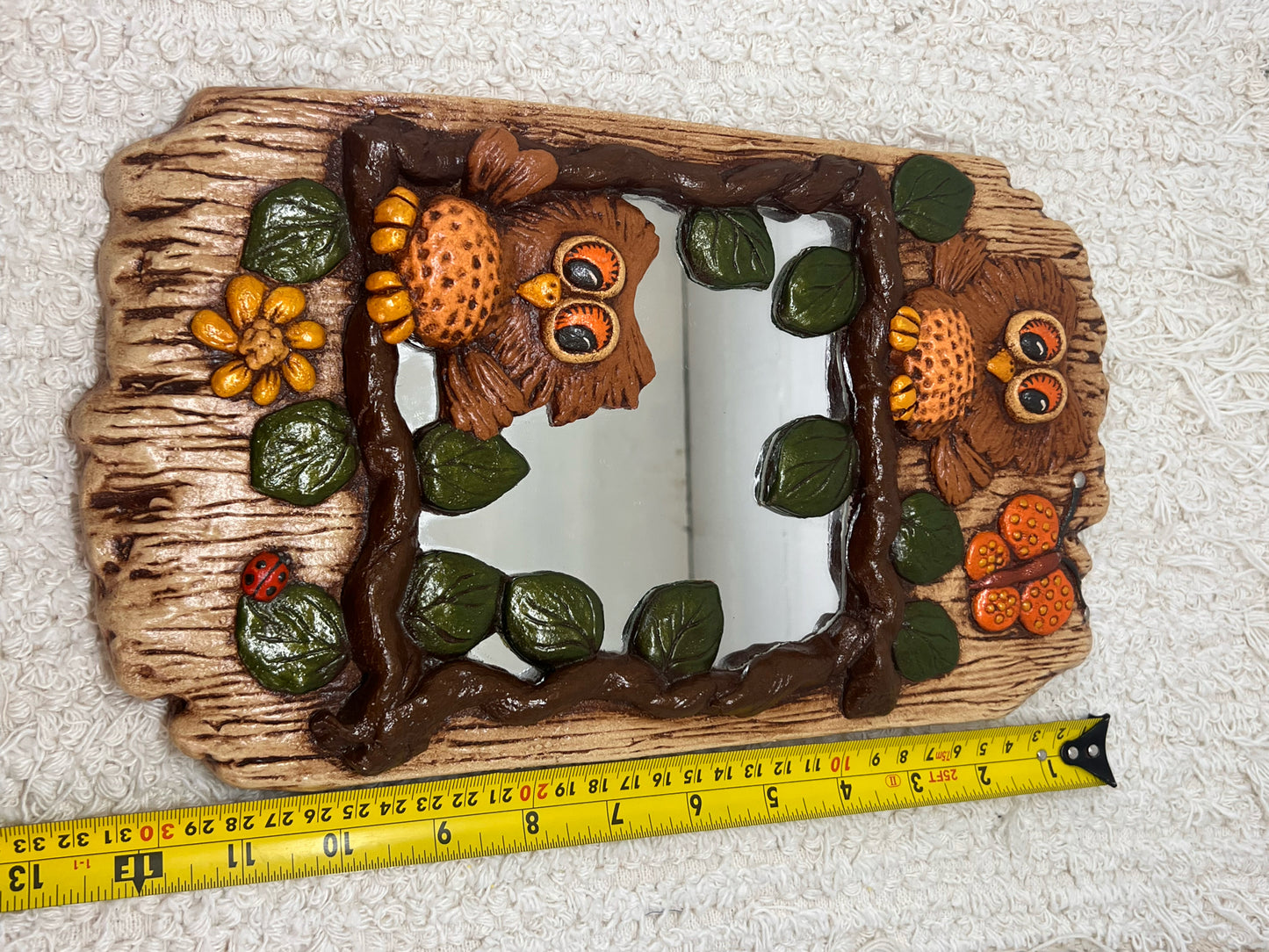 Ceramic framed mirror from the 1970's/1980's featuring owls, a butterfly, lady bug, leaves and braches. Excellent condition w/ no chips or cracks noted. Measures approx. 12 x 7". So sweet!