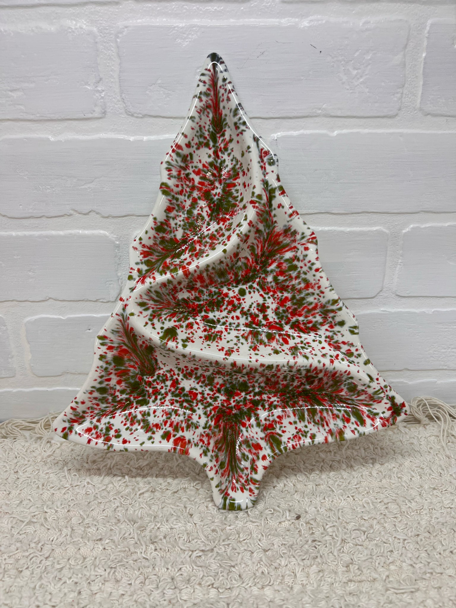 Vintage 1970's ceramic Christmas Tree shaped cookie or relish tray- divided- decorated in red and green spatters. A Christmas classic! Small rough area on one corner, see pic.