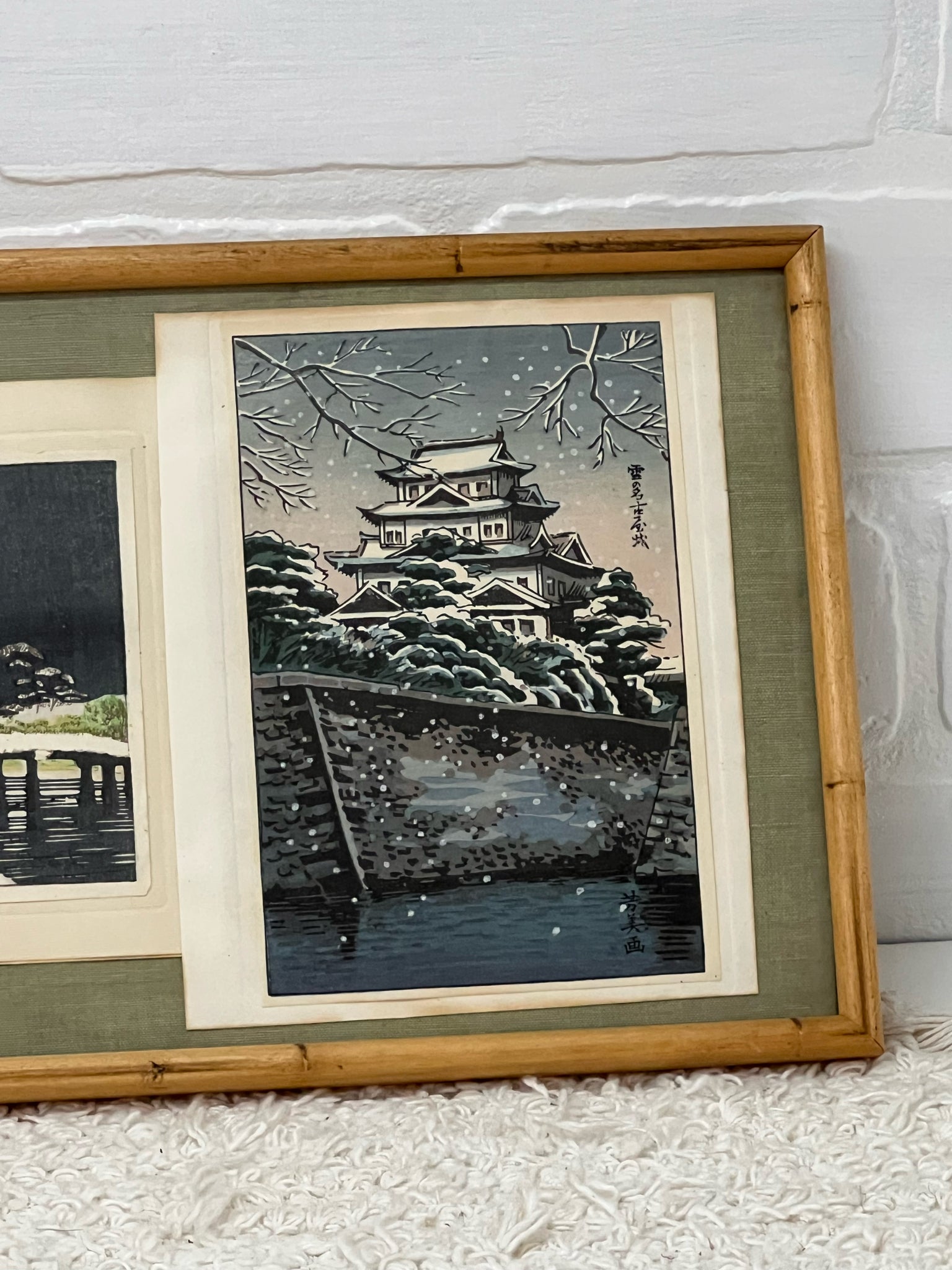 A series of 3 Japanese wood block print postcards backed with green silk. They depict snowy winter scenes. Wooden frame carved to look like bamboo. measures just shy of 17" long, 7" wide.