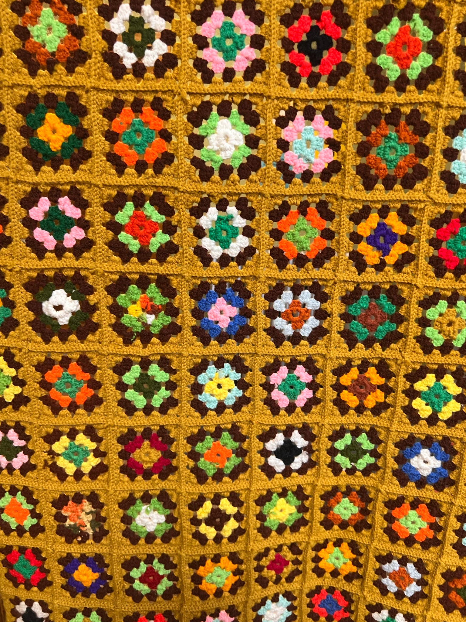 This granny square blanket is retro and so fun! Made of a gold colored base yard, the squares are from brown and a variety of other color yarns. Measures 40" by 54".