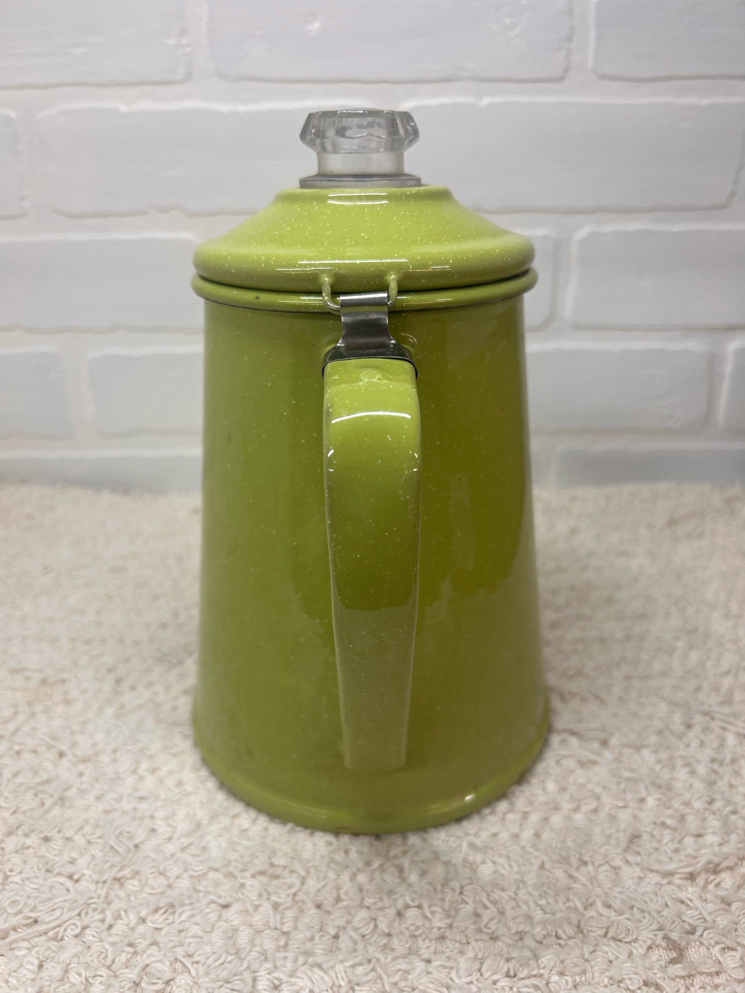 Green Enamel speckled percolator coffee pot. Outside bottom has a little rust. Lid top insert is clear plastic. Great looking coffee pot!