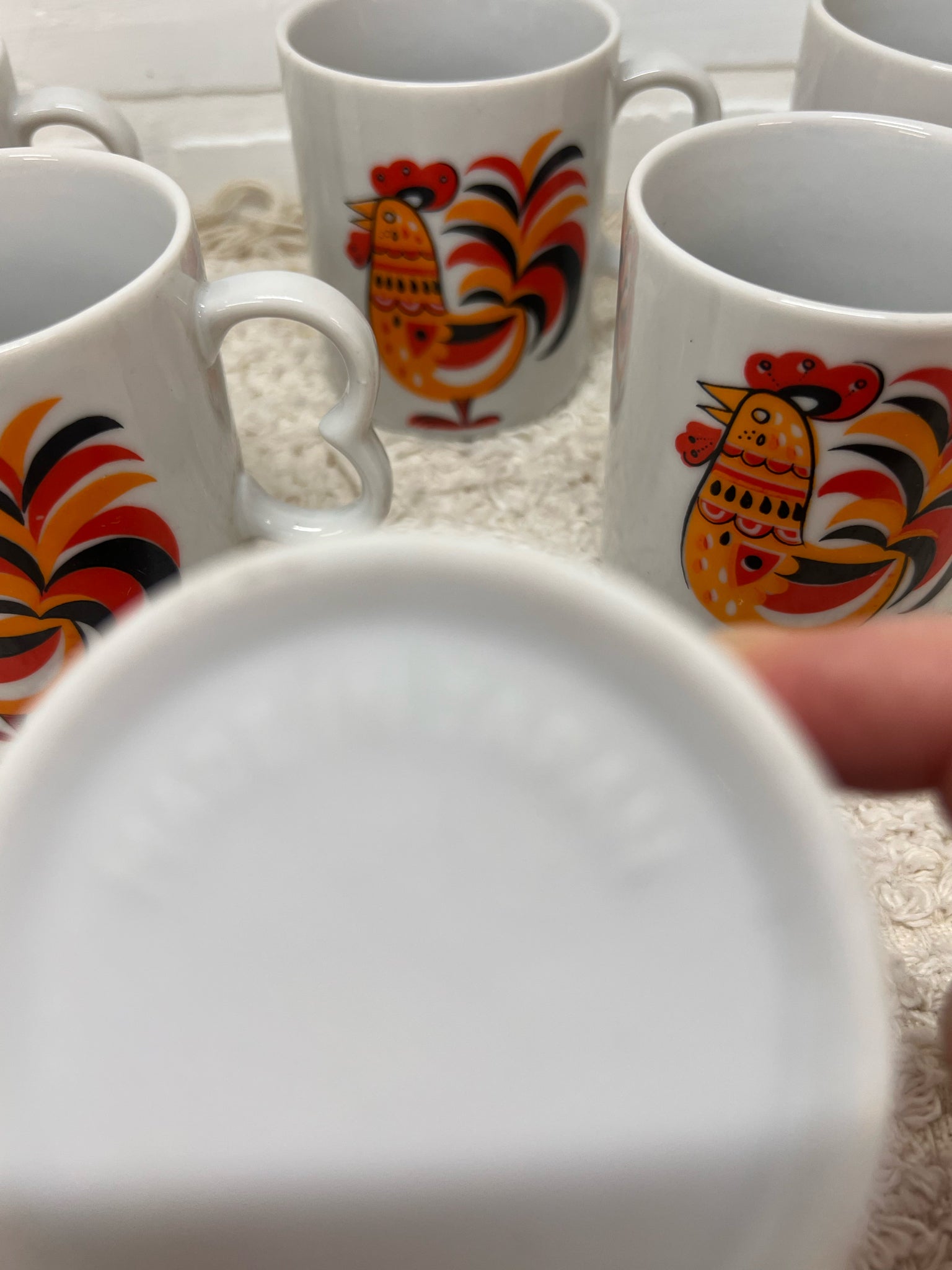 Set of SIX made in Japan stylish MCM chicken mugs. White mugs, stamped JAPAN on bottom. Good condition. Orange/black/red colored chicken. Measures 3" tall.