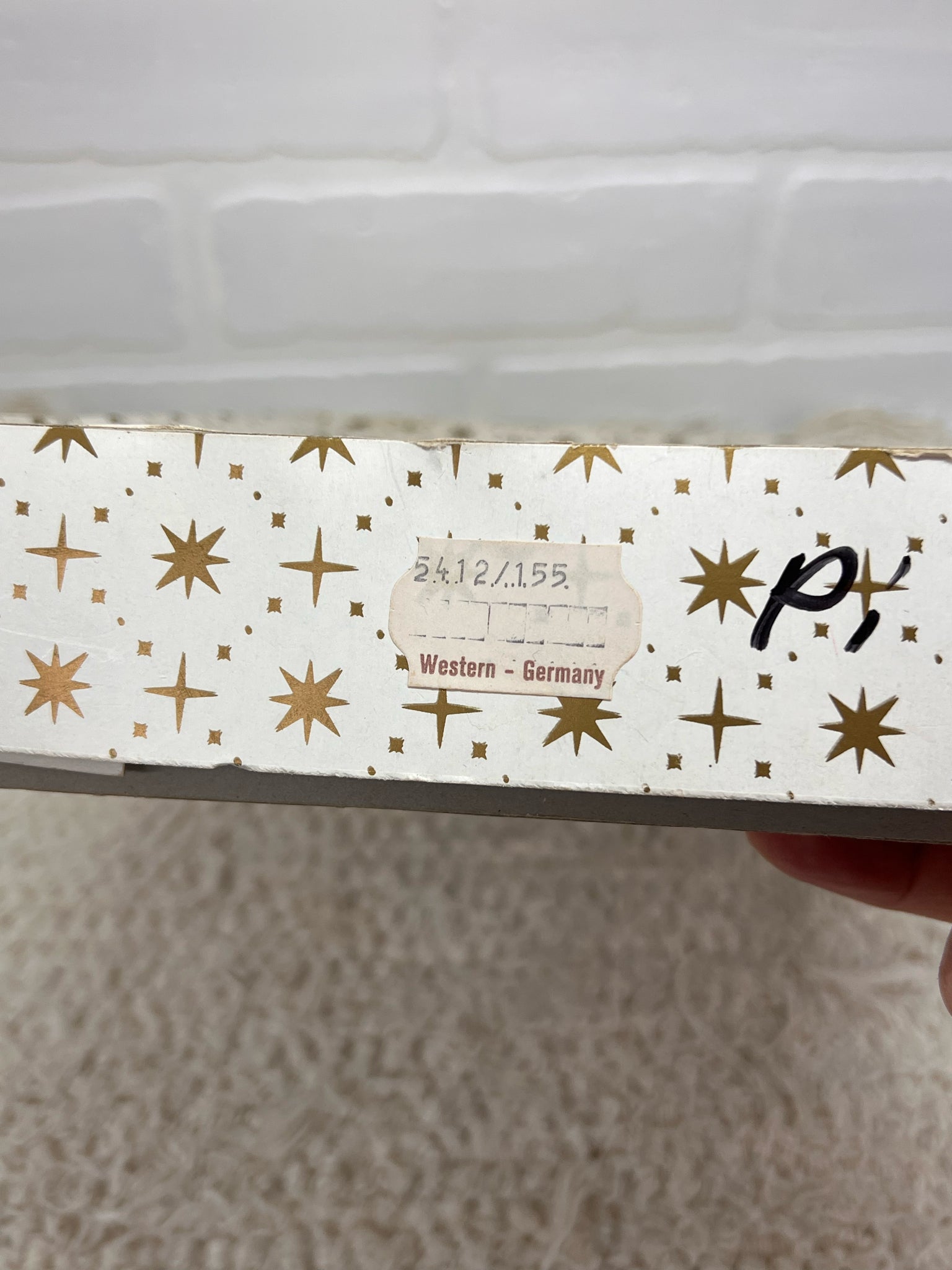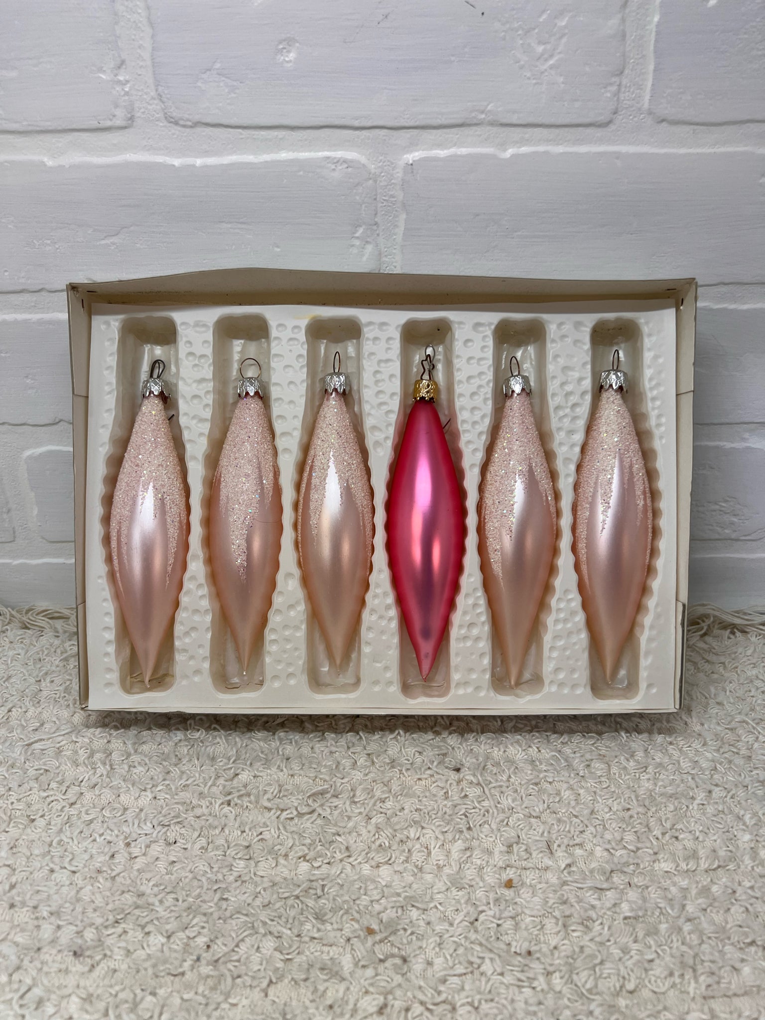 Set of 6 pink icicle shaped ornaments - 5 are pale pink w/ white glitter, the 6th is hot pink and not original to the set. Box indicates the 1st five were made in Western Germany. Such a pretty, dreamy ornament set! Measures nearly 6" tall.