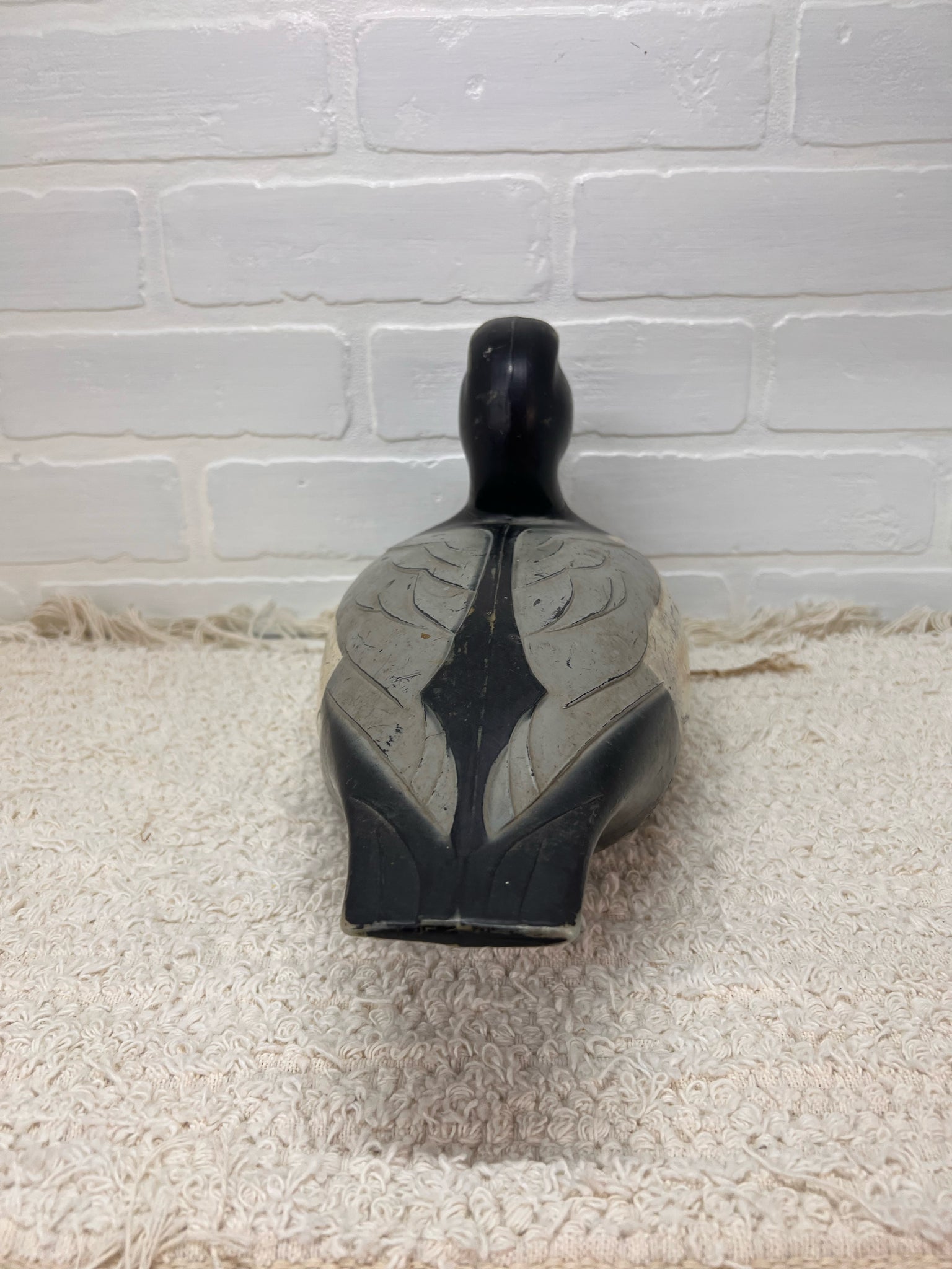 vintage plastic duck decoy with some wear, though no doubt still alluring to his fellow ducks! Measures approx 13" long tail to bill.