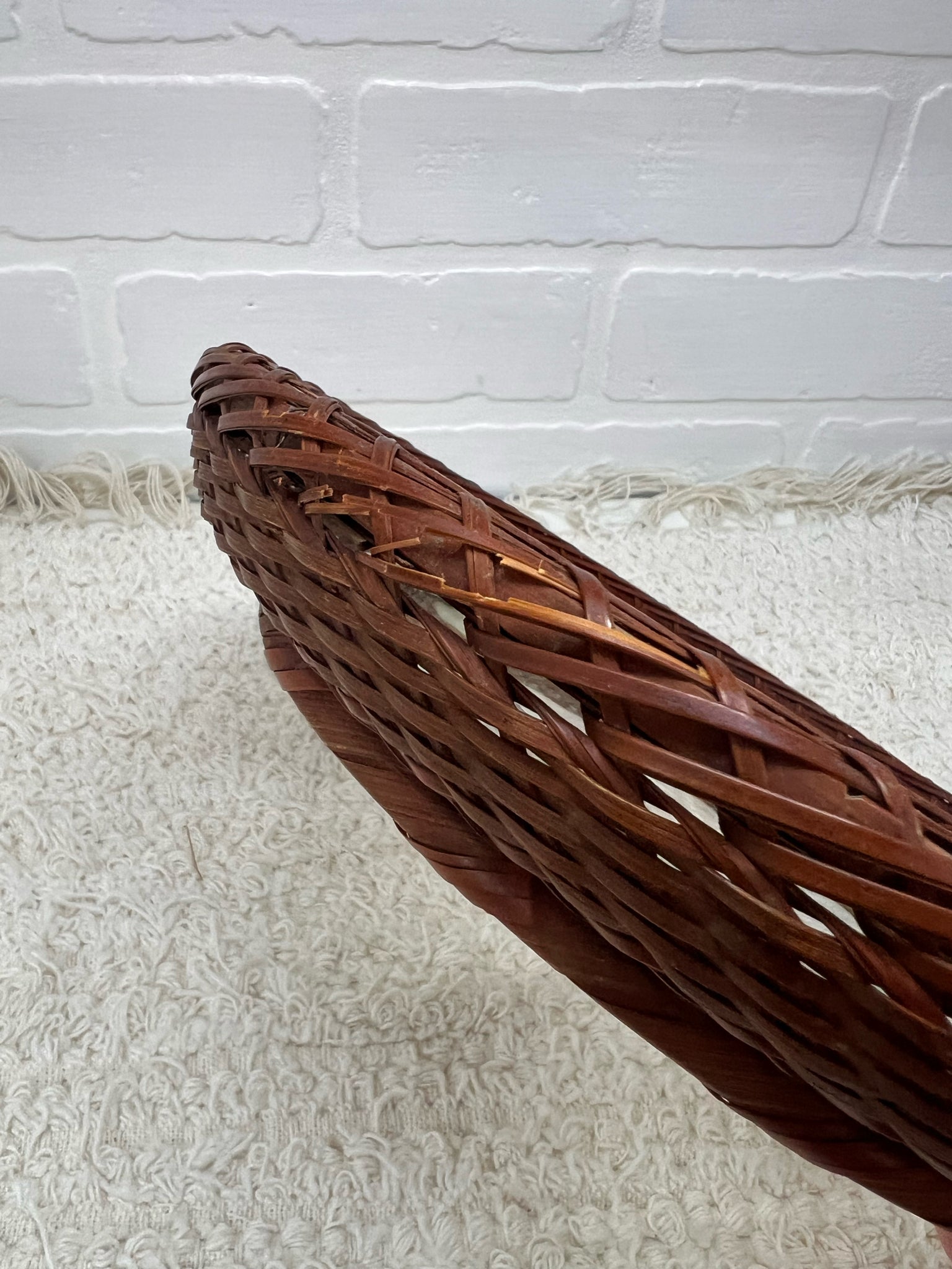 Vintage glass bottomed pressed butterfly tray surrounded in basket. Round, measures approx 10" in diameter, and nearly 2" tall with rim. There is a small area of breakage to one side of the basket rim. A very sweet vintage piece for serving or display.