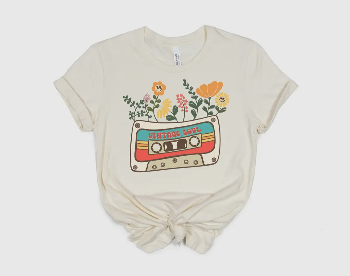 Are you a vintage soul? Say it with this fun, retro inspired t-shirt! Design is pressed onto Bella Canvas poly/cotton blend unisex t-shirts. These are flattering, comfortable and oh-so cute!Â