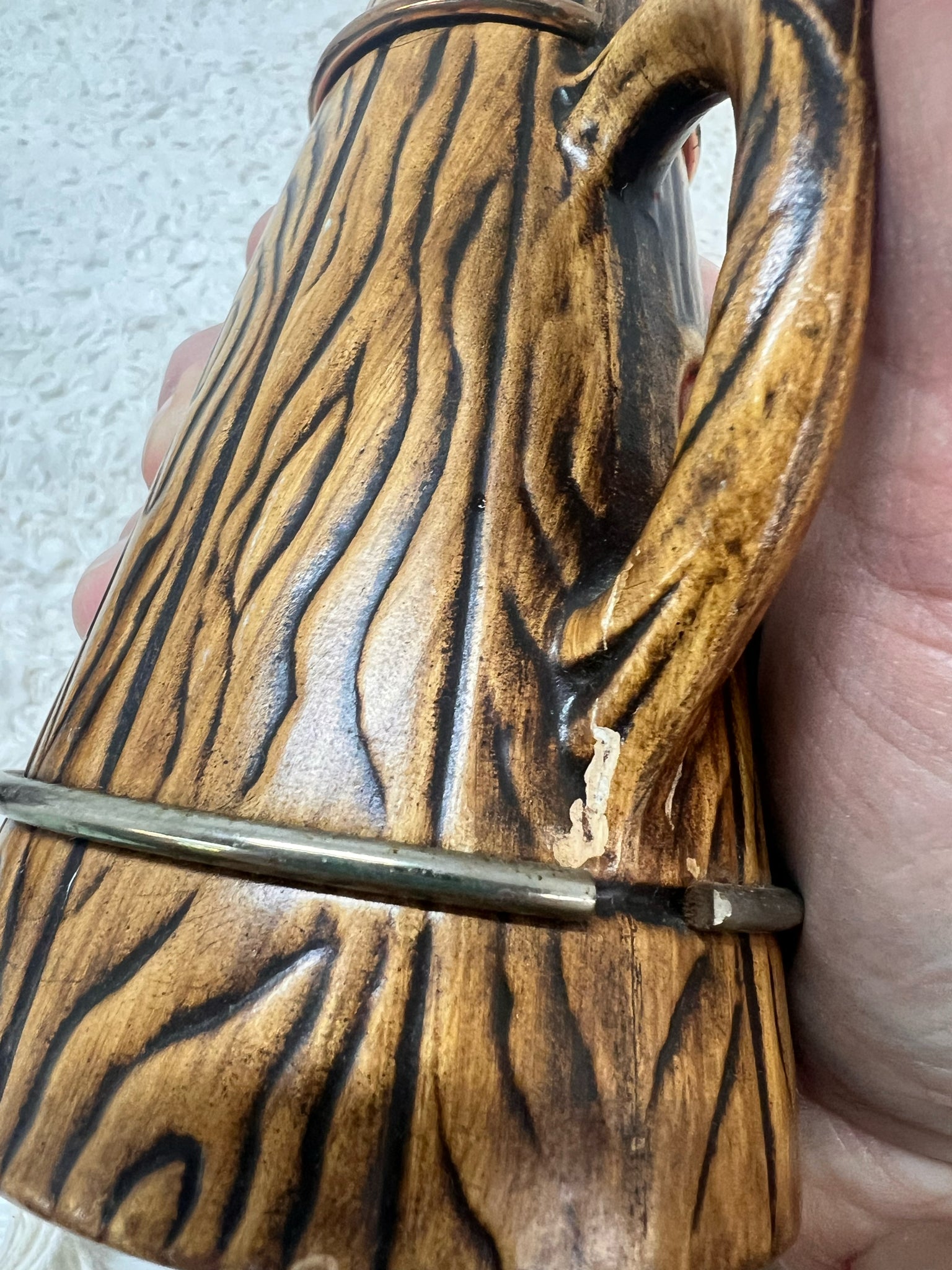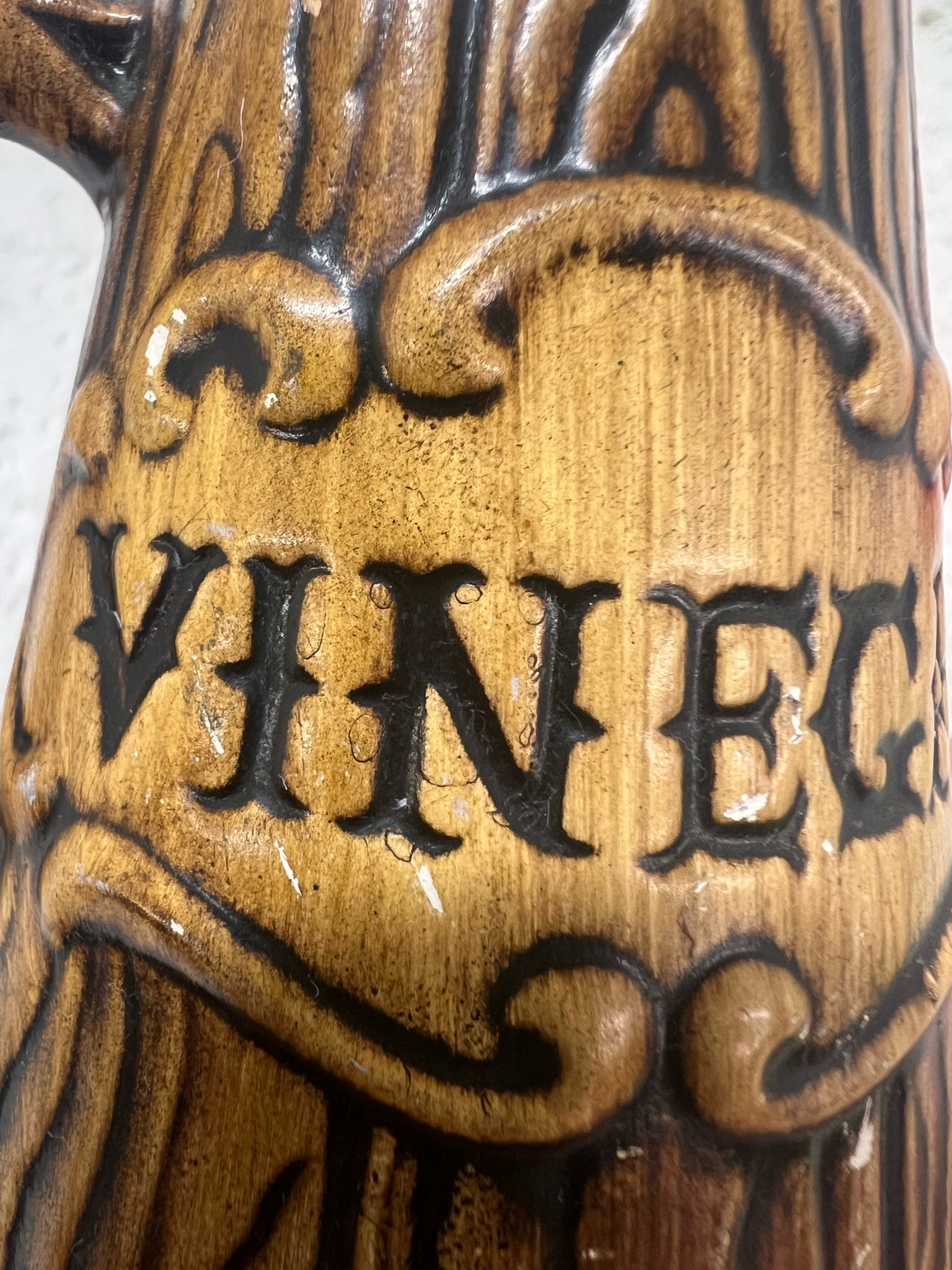 Vintage Treasure Craft brand oil and vinegar cruets. No tops, two ceramic handled vessels with pouring spouts. They are ceramic and made to look like barrels with copper rings. each measures 5" tall. Some paint loss noted to vinegar vessel- see pics.