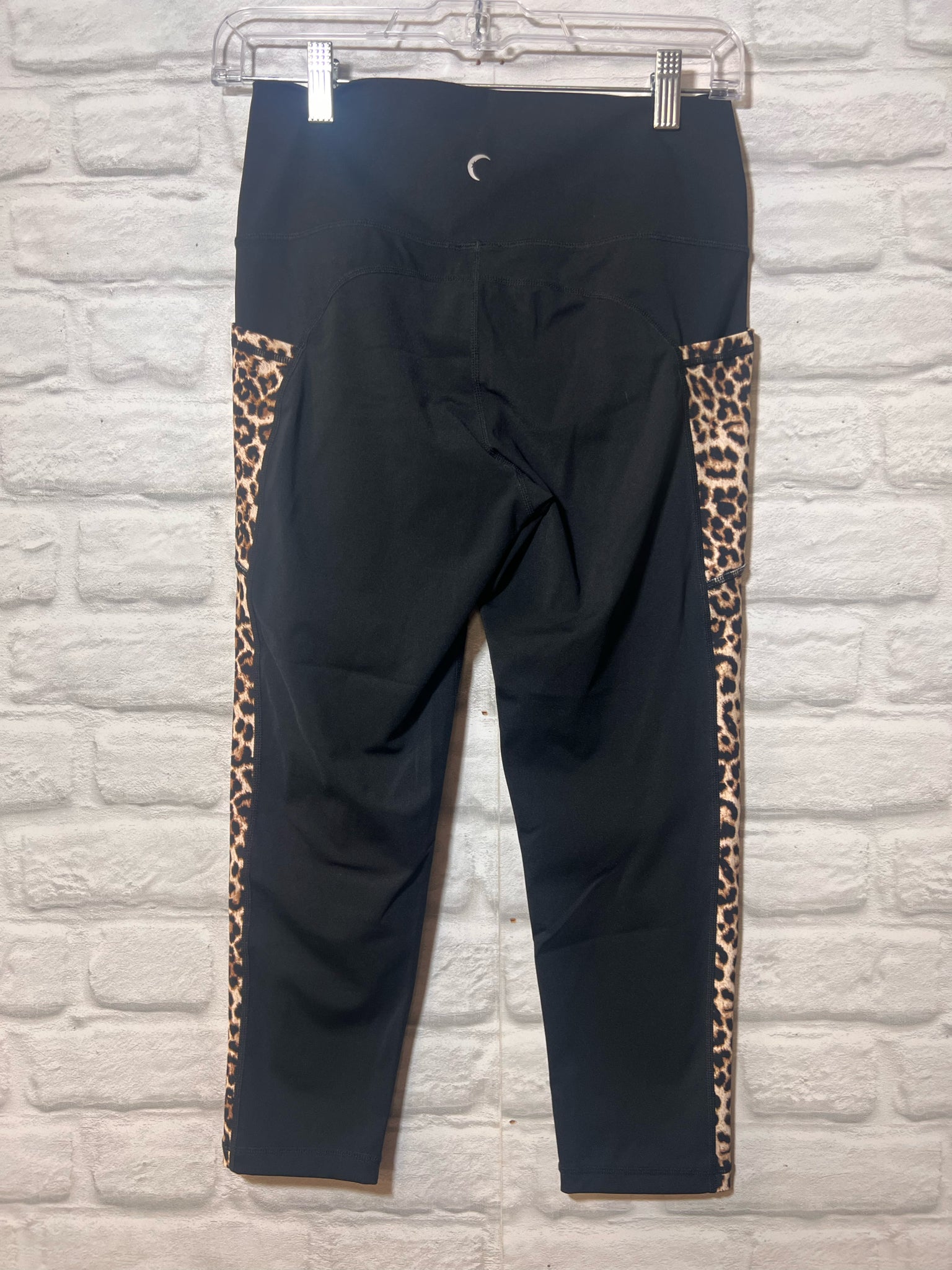 Capri length black leggings from Zyia, appear to be unworn! Leopard detail along sides.